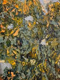 La tavolozza, dominata da verdi profondi e azzurri vibranti, è arricchita da accenti caldi che suggeriscono una luce solare diffusa, capace di conferire profondità e vitalità alla scena. L’opera si inserisce nel solco della tradizione espressionista contemporanea, con evidenti richiami alla pittura paesaggistica reinterpretata in chiave emotiva e personale.