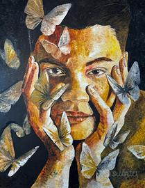 Vendesi suggestivo dipinto realizzato a mano con tecnica olio su tela. L'opera ritrae un volto maschile in primo piano, circondato da un volo di farfalle che sembrano sprigionare luce propria contro uno sfondo scuro e profondo.