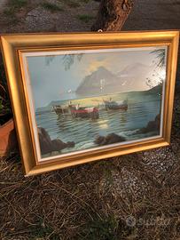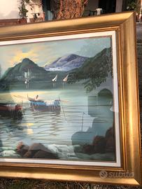 Dipinto a olio su tela raffigurante montagne, barche e mare con pescatori.