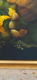 Vendo questo quadro molto bello e grande, un olio su tela con una natura morta ricca di frutta e fiori.