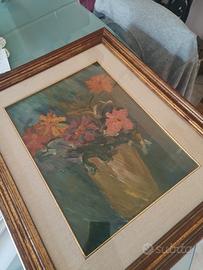 Vendo dipinto olio su tela raffigurante un vaso di fiori dai colori caldi. Pittura ad olio, stile impressionista. Il quadro è racchiuso in una cornice in legno con sfumature dorate e passe-partout. Dimensioni totali cm 50x60.