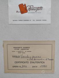 Vendo quadro olio su tela del pittore Francisetti Gilberto realizzato nel 1990. Misure esterno cornice 66 cm x 77 cm. Richiesta €. 150,00. Consegna e pagamento a mano a Torino e prima cintura – NO SPEDIZIONI
