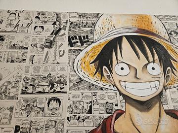 Vedo quadro dipinto a mano su tela 50x70 cm. Sfondo fogli fumetto one piece e al centro il personaggio dipinto con colori acrilici.
