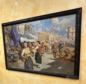 Soggetto: La tela raffigura una vivace scena di mercato napoletana. In primo piano spicca una giovane donna (popolana) con un cesto di frutta, circondata da figure intente alle attività quotidiane tra le bancarelle.