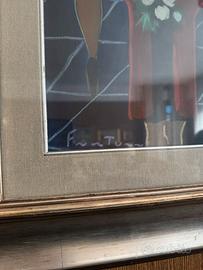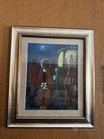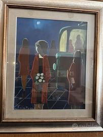 Affascinante dipinto a olio su tela del maestro Eliano Fantuzzi (1909-1987), tra i più importanti esponenti della Scuola Romana. L'opera cattura un momento di vita urbana sospeso nel tempo, immerso in quell'atmosfera onirica e notturna che ha reso celebre l'artista in tutto il mondo. Soggetto: Una scena di strada notturna con figure femminili eleganti in cappotto rosso (colore tipico della tavolozza di Fantuzzi). Al centro, una donna tiene un mazzo di fiori bianchi, aggiungendo un tocco di luce e poesia alla composizione. Sullo sfondo si scorge la sagoma di un mezzo pubblico o di una vetrina illuminata sotto un cielo dominato da una luna soffusa. Stile: Caratterizzato da pennellate fluide e dal forte contrasto tra i blu profondi della notte e i caldi rossi delle figure, tipico della cifra stilistica di Fantuzzi che unisce espressionismo e realismo magico. Condizioni: Il quadro è in ottimo stato di conservazione. È incorniciato con una cornice d’epoca in legno con finitura argento e oro e passe-partout in tessuto, che completa elegantemente l'opera. (MISURE, senza cornice, 55x45cm) Firma: Firmato chiaramente dall'artista in basso a sinistra. Ritiro e trasporto a carico dell’acquirente.