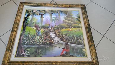 Vendo quadro originale dipinto a mano, firmato K. Pinto e datato 1996. L’opera raffigura una scena tropicale ricca di vita e colori, tipica dell’arte naïf dei Caraibi, probabilmente di origine dominicana.
