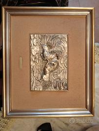 Elegante bassorilievo firmato Ottaviani, raffigurante due cavalli in movimento tra le onde. Realizzato in metallo argentato/dorato (da verificare eventuale punzonatura), montato su passepartout e impreziosito da importante cornice in legno dorato.