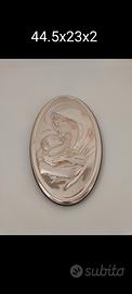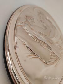 Quadro ovale in argento raffigurante la madonna con il bambino con retro in legno, presente foro per essere appeso. Dimensioni in foto