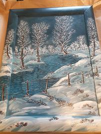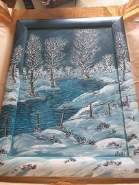 Quadro dipinto a mano rappresentante paesaggio invernale con fiume/ruscello, è dipinta anche la cornice, realizzato su tela. Tenuto benissimo. Vendo causa mancanza di spazio e quindi inutilizzato. Il prezzo è trattabile. Per qualsiasi informazione o interesse contattare.