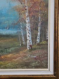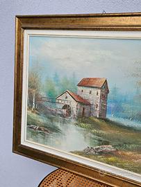 Quadro Paesaggistico con Mulino e Cornice in legno laccato in oro.