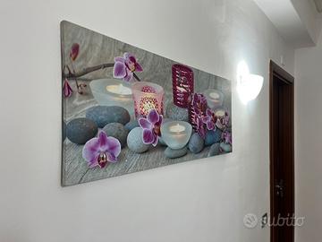 Elementi floreali con orchidee viola. - Candele accese in portacandele di vetro. - Sassi levigati come base. - Sfondo effetto legno. Misure: 100 X 40.