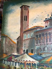 Opera olio su tela di Bruno Schio degli anni ‘80 raffigurante Piazza Dei Frutti a Padova. Misure 30 cm x 40 cm.