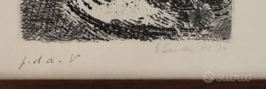 Rara ed emozionante opera d'arte originale, datata Roma, Ottobre 1973. Il quadro unisce una composizione poetica manoscritta dedicata a Pablo Neruda (scritto a poche settimane dalla sua scomparsa) e un'incisione originale a destra. L'opera è una P.D.A. (Prova d'Autore), come indicato chiaramente a matita sotto l'immagine, ed è firmata e datata dall'artista in basso a destra. Il Testo: Una potente dedica civile e poetica al grande poeta cileno Neruda: "Nel tuo giardino razzolano porci e sciacalli; ma i tuoi semi, al sicuro nel cuore degli uomini, presto germoglieranno… e saranno folgori, i tuoi fiori, spade, le tue foglie." A destra: Un’incisione che ritrae un volto femminile intenso e malinconico. Il disegno è caratterizzato da un forte contrasto chiaroscurale e un tratteggio deciso tipico dell’espressionismo grafico degli anni '70. Il disegno trasmette una sensazione di introspezione, dolore e forza interiore. È un ritratto non realistico nel senso fotografico, ma profondamente psicologico, che si sposa perfettamente con il tono solenne e commosso della poesia dedicata a Neruda a sinistra. Cornice: Cornice originale in legno scuro, che protegge perfettamente l'opera. Stato: Ottime condizioni vintage. Dimensioni: 40x30 cm Pezzo unico da collezione. Consegna a mano su Padova e provincia