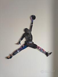 Un’opera che fonde sport e cultura pop in un dialogo visivo unico. La celebre silhouette del Jumpman, simbolo di energia e movimento, si stacca da un pannello vibrante ricco di icone del fumetto, del cinema e della street culture: Batman, Iron Man, Vegeta, Tom & Jerry e riferimenti fantasy come The Lord of the Rings. Sullo sfondo emerge anche la figura di Kobe Bryant, icona del basket mondiale, che aggiunge profondità e significato alla composizione. Il gioco tra pieno e vuoto, collage e ritaglio, trasforma un’icona sportiva in un racconto contemporaneo, dinamico e multiforme.