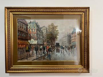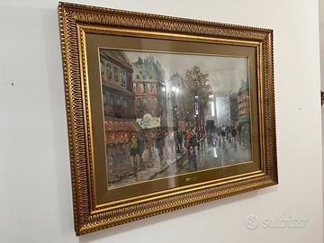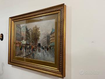 L'opera d'arte mostrata nell'immagine è un dipinto a olio su tela che raffigura un caratteristico paesaggio urbano di Parigi, più precisamente un animato boulevard sotto la pioggia. L’artista Giulio De Simone dipinse questa tela tra anni 70 /80 . Il dipinto è completo di cornice dorata Accetto offerte Ritiro a mano dopo visione