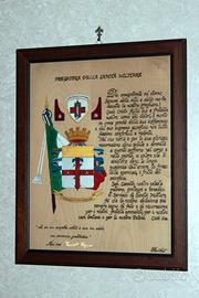QUADRO RAFFIGURANTE STEMMA ARALDICO ,FREGIO E MOSTRINE REGGIMENTI BERSAGLIERI SU TRICOLORE E PREGHIERA DEL BERSAGLIERE SCRITTA INTERAMENTE A MANO.L' IMMAGINE NON E' NE STAMPATA, NE TANTO MENO DECOUPAGE, MA DIPINTA CON COLORI ACRILICI E REALIZZATO SU SUPPORTO LIGNEO. IL CONTRASTO DELLE VENATURE DEL LEGNO LO RENDE VERAMENTE AMMIREVOLE E..., CREDETEMI QUANDO VI DICO CHE A CASA VOSTRA O IN UFFICIO, NON PASSERA' SICURAMENTE INOSSERVATO. LA SPEDIZIONE AVVERRA' A MEZZO CORRIERE ESPRESSO CON NUMERO TRACCIABILITA' PACCO ANCHE IN CONTRASSEGNO O CONSEGNA A MANO.