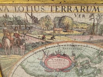 Puzzle incorniciato con una mappa antica del mondo. - Raffigurazione Nova Totius Terrarum Orbis Geographica. - Cornice in legno scuro.