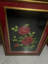 Questo quadro raffigura un bellissimo mazzo di rose rosse con foglie verdi, su uno sfondo nero. Le rose sono tre principali: due grandi e una più piccola in basso a sinistra, tutte collegate da rami marroni. I petali sono di un rosso intenso, con sfumature più scure che danno profondità e realismo al disegno.