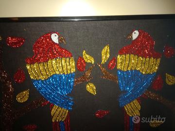 Bellissimo quadro raffigurante 2 pappagalli coloratissimi completamente ricamato a mano su tela di cotone da un artista toscana. Misure 80x60 . Per la spedizione sarebbe meglio togliere la cornice.