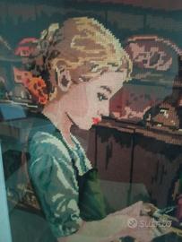 Quadro ricamato grande, 70×80cm con ragazza in cucina / pela patate. Molto vecchio e tenuto perfettamente, inclusa cornice argentata