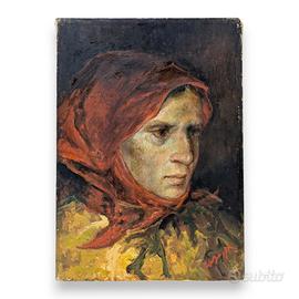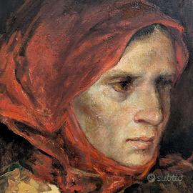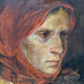 Il dipinto raffigura una figura femminile dal volto fortemente espressivo, colta in una posa raccolta e intensa. La donna, resa con rapidi colpi di pennello e toni accesi di rosso e arancio, sembra quasi emergere dalla materia pittorica, trasmettendo un senso di tensione emotiva e vulnerabilita'.