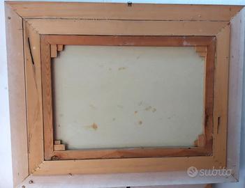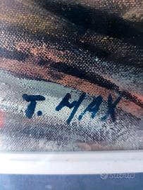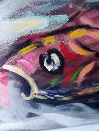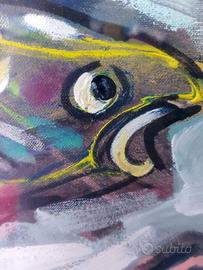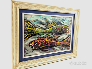 T. MAX Composizione Dinamica con Pesci - Neo-Espressionismo Materico Descrizione dell’Opera Descrizione Generale: Affascinante opera pittorica di matrice Neo-Espressionista, firmata in basso a destra dall’artista T. MAX. Il dipinto raffigura due pesci che nuotano in direzioni opposte, immersi in un ambiente acquatico reso con estremo dinamismo. L'opera si distingue per una carica vitale dirompente e un uso sapiente della luce e del contrasto cromatico. Tecnica e Stile: L’opera è realizzata con una tecnica mista (olio e pastelli grassi) su tela, caratterizzata da una stesura materica e gestuale. L’artista utilizza pennellate spesse e decise (tecnica "alla prima") che conferiscono tridimensionalità e vigore ai soggetti. I contorni grafici, tracciati con tratti decisi, sottolineano l’espressività quasi drammatica dei pesci, le cui bocche aperte evocano un senso di respiro e movimento frenetico. Tavolozza Cromatica: Un contrasto audace tra toni caldi e freddi: il pesce superiore domina con gialli acidi e verdi brillanti, mentre quello inferiore risalta con rossi profondi e ocra. Lo sfondo, un turbine di bianchi, grigi e blu ardesia, crea una profondità atmosferica che esalta la brillantezza dei soggetti in primo piano. Stato di Conservazione e Presentazione: L'opera si presenta in eccellenti condizioni conservative. È impreziosita da un'imponente cornice classica in legno lavorato di color crema/bianco avorio, completata da un elegante passepartout in tessuto blu profondo che incornicia e dona profondità alla tela. Scheda Tecnica Artista: T. MAX Titolo: Senza titolo (Dinamismo marino) Tecnica: Tecnica mista / Olio su tela (Materico) Epoca: Seconda metà del XX secolo (ca. 1980-1995) Dimensioni Opera (Luce): 50 x 70 cm Dimensioni Totali (con cornice): 76 x 97 cm Peso: 3 kg circa Condizioni: Ottime Firma: Firmato a mano in basso a destra "T. MAX"