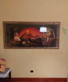 Quadro Papiro Egiziano Originale – Maschera di Tutankhamon – Incorniciato Vendo splendido quadro realizzato su vero papiro egiziano, acquistato direttamente in Egitto. Non si tratta di una stampa economica, ma di un'opera artigianale che conserva la trama tipica della fibra di papiro. Il soggetto raffigura l'iconica Maschera Funeraria di Tutankhamon, simbolo intramontabile della civiltà egizia, arricchito sullo sfondo dalle Piramidi di Giza al tramonto. Caratteristiche principali: • Materiale: Papiro autentico con bordi sfrangiati a vista (segno di originalità). • Colori: Vivi e vibranti, con dettagli dorati che risaltano alla luce. • Cornice: Inclusa nel prezzo, elegante finitura dorata con lavorazione classica che si abbina perfettamente al soggetto. • Protezione: Il papiro è protetto da vetro per preservarne l'integrità nel tempo. Stato dell'oggetto: Il quadro è in ottime condizioni, conservato con cura in ambiente privo di umidità. La cornice è integra e pronta per essere appesa. Un pezzo d'arredo perfetto per amanti dell'archeologia, della storia egizia o per chi desidera un tocco etnico e raffinato in casa. Dimensioni • Misure totali (con cornice): lunghezza 96 cm a largezza 200 cm