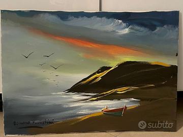 Vendo olio su tela (49x70 cm) di Romano Mussolini, raffigurante una suggestiva marina dipinta con il suo caratteristico stile figurativo ed espressivo. L’opera, in buone condizioni e non incorniciata, proviene da un lotto consegnato personalmente a un conoscente di Rocca San Casciano (FC), garantendo una provenienza lecita.