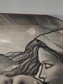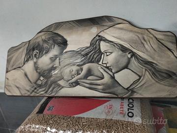 Splendida rappresentazione della Sacra Famiglia su pannello sagomato. Il tratto è delicato, quasi come un carboncino, perfetto per ambienti caldi o come regalo simbolico.