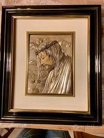 Osserva il volto di Cristo che emerge con una presenza intensa e silenziosa. La lamina d'argento 800/1000 lavorata a rilievo cattura la luce in modo delicato, creando riflessi morbidi che cambiano a seconda dell'angolo da cui lo si osserva, come se l'immagine respirasse insieme a chi la guarda.