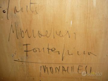 Opera originale del pittore Sante Monachesi, olio su tavola, raffigurante case del Borgo di Fontespina (MC), acquistato a Roma negli anni 70. Firma autografa fronte, firma autografa e titolo sul retro. Misure cm 50x60.