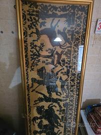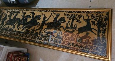 Bellissimo quadro antico in stile sardo, perfetto per aggiungere un tocco vintage al tuo salotto. L'opera raffigura una scena di caccia con figure stilizzate.