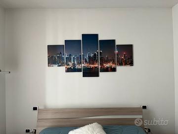 Quadro scomposto Manhattan New York in notturna, in ottime condizioni. Stampa su tela. Scomposto in 5 pezzi, tutti con base da 30 cm e altezze variabili di cui il pezzo lungo ha altezza 80 cm, i pezzi intermedi altezza 60 cm e i pezzi corti altezza 40 cm. No spedizione, solo consegna a mano