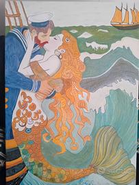 Cedo a persona amante dell'arte quadro da me eseguito a tema sirena tecnica mista olio su tela e acrylic paint pen