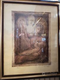 Opera d'arte incorniciata. - Raffigurazione di figure sacre. - Tecnica mista su carta. - Firma dell'artista visibile.