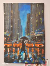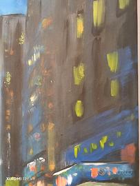 Le pennellate sono libere e decise, volutamente non descrittive, e costruiscono l’immagine attraverso riflessi, vibrazioni cromatiche e contrasti di luce. I toni freddi del blu e del grigio dialogano con le accensioni calde dei taxi e delle luci urbane, creando un equilibrio dinamico tra movimento e silenzio.