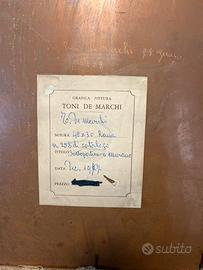 L'opera è catalogata con il numero 258 e datata 1987. Quindi un pezzo da collezione, artista Toni De Marchi. Questa opera d'arte, intitolata "Sotto il portico", è un'incisione originale dell'artista veneziano Franco De Marchi, che ritrae una suggestiva veduta di Venezia incorniciata da un colonnato.