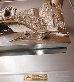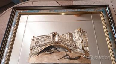 Vendo quadro su specchio con bassorilievo del Ponte di Rialto (Venezia), opera di Silvio Zippoli. Cornice decorata con motivi azzurri e profili dorati.