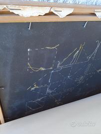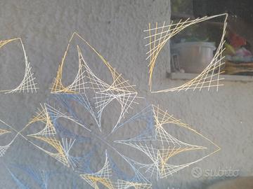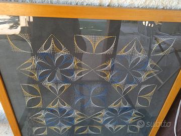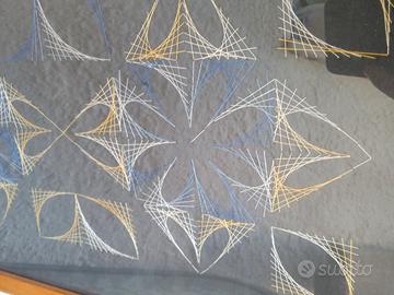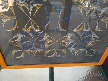 Quadro anni 90 di string art, disegno geometrico, dai colori in contrasto - Fili in cotone giallo, bianco, blu e celeste . Cornice in legno naturale misura circa 54x54cm...
