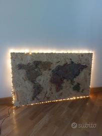 quadro mappamondo con arte del filo, fatto di chiodi e filo colorato. 100x60 bellisaimo sia spento che acceso. le luci hanno vari effetti e rimangono anche accese fisse. ritiro a mano, no perditempo.