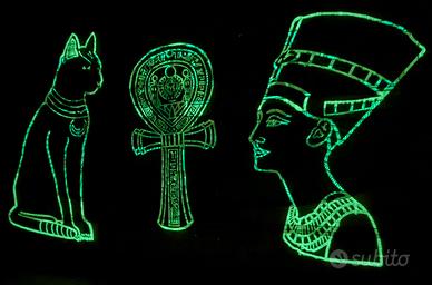 quadro su papiro egiziano con cornice color olmo di dimensioni 125,2 cm di larghezza per 68,5 cm di altezza. ha due disegni: uno visibile di giorno alla luce, l’altro al buio a luci spente. al buio cambia disegno poiche presenta un disegno secondario fotoluminescente che si “carica” stando alla luce sia di raggi ultravioletti, sia attraverso una lampada di Wood (luce nera) oppure attraverso luce led fredde (bianco puro). acquistato in Egitto e incorniciato in Italia.