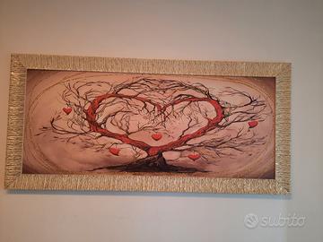 Bellissimo quadro su tela, 132 cm x 62 cm, tema Albero dell'amore, con cornice color oro molto elegante e dettagli dorati. Cornice e tela sono già montati, basta appendere il quadro. Decorato con brillantini a mano inseriti nei punti luce per dare profondità e lucentezza alla tela. Misure 132 x 62 compresa la cornice. Ottime condizioni, come nuovo, nessun difetto o segno di usura, vendo per cambio stile arredamento.