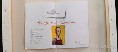 L'opera "Madonna Lignea" di Antonio Sciacca presenta un manichino in legno stilizzato al centro, richiamo ai modelli classici e simbolo di spiritualità. Il volto, seppur stilizzato, comunica intensa emotività, con dettagli e ombreggiature che creano una sottile tridimensionalità. Lo sfondo vibrante, con tonalità calde di giallo antico e bordeaux, conferisce dinamismo. La tecnica di Sciacca si evidenzia nelle pennellate audaci e nei dettagli grafici, fondendo rigore e libertà espressiva in una complessità visiva affascinante. "Madonna Lignea" è un significativo contributo all'arte contemporanea, unendo tradizione e innovazione. Riconosciuta a livello nazionale e internazionale, viene fornita con autentica firmata dal maestro e certificato del nostro negozio, con spedizione professionale e assicurata. Prezzo trattabile