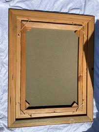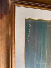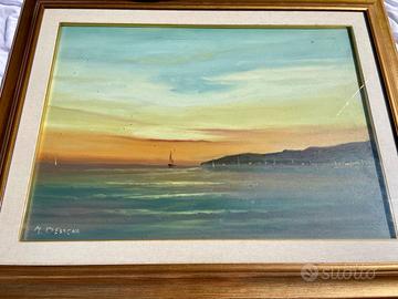 Quadro dipinto su tela raffigurante un paesaggio marino al tramonto, ispirato a La Maddalena, opera firmata da M. Dessena. La cornice è in legno con finitura color oro, in buone condizioni. Le dimensioni complessive, inclusa la cornice, sono 90x70 cm, mentre la tela misura 50x70 cm. L’articolo è in buono stato generale e viene venduto al prezzo di 300 euro.