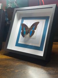 Bellissimo quadro con farfalla tassidermizzata, ideale per decorare qualsiasi ambiente. - Cornice in legno con finitura grigia. - Passepartout a più livelli con sfondo blu e bianco. H 21.5 cm L 21.5 cm P 4.5 cm