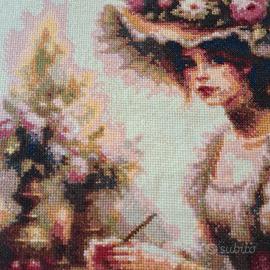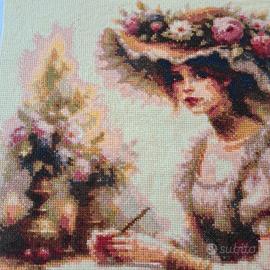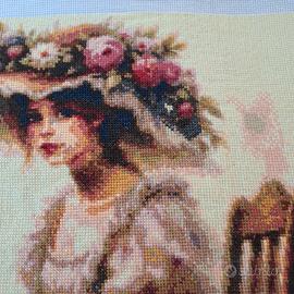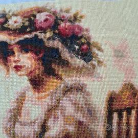 tela misura 50 x 50cm ricamata a mano punto croce raffigurante dama con cappello fiorito