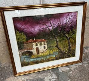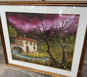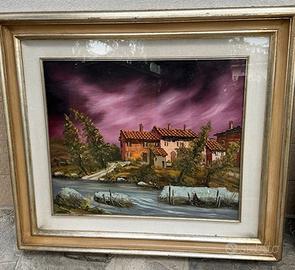 Quadro tempera Case sul fiume con cielo viola - misure diam. est. 76,5x65 - diam. int. 59x49 - Autore Duccio, Pittore Locale - è un quadro robusto e grande, con pittura ben eseguita - ritiro a Bologna o spedizione con Tutto Subito