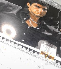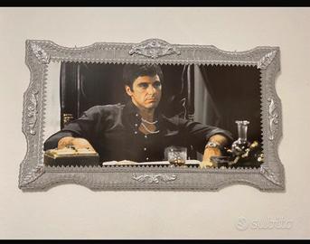 Vendesi pezzo di arredamento di impatto raffigurante l’indimenticabile Tony Montana (Al Pacino) in una delle scene più celebri del film Scarface. Il quadro è caratterizzato da una cornice argentata con finitura opaca e decorazioni in rilievo lavorata con uno stile barocco/retrò che ne esalta il carattere, rendendolo perfetto per dare personalità a una zona living, ufficio o una taverna.
