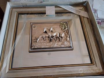 quadro 3 cavalli d argento su sfondo a specchio, rilievo in laminato d argento 925 misure 56*50