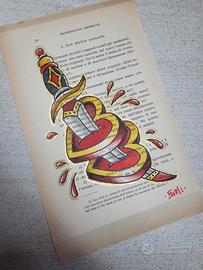Dipinto stile traditional tattoo su pagina di libro vintage. Raffigura un cuore trafitto da un pugnale, con dettagli dorati. DIPINTO A MANO! - Stile: Traditional Tattoo - Soggetto: Cuore e Pugnale - Tecnica: Pittura su pagina di libro antico. pezzo unico. - Dettagli: Bordi e contorni dorati cornice con vetro 15x20cm. #traditionaltattoo #tattooart #oldschooltattoo #heart #cuore #pugnale #knife #dipintoamano #madeinitaly #arte #vintage